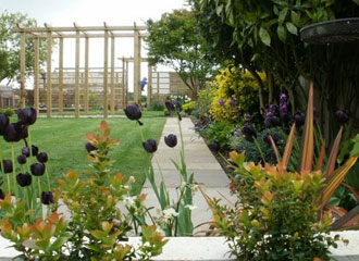 The first time I met with these clients it was obvious that they shared a love of plants and very much enjoyed their garden as well as the allotment. The garden already contained some established plants as well as a pond, greenhouse and raspberry bed. The problems were that the existing patio was too small, the garden lacked structure and was also very exposed being south facing and backing onto fields. I decided to divide the garden into three areas. The patio, pergola and raised herb beds are close to the house, the central lawn, borders and path comprised the mid section of the garden with the final section of the garden reached via a pergola walkway has a deck overlooking the pond, a circular lawn and borders filled with colour and texture.