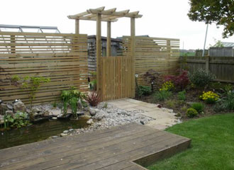 The first time I met with these clients it was obvious that they shared a love of plants and very much enjoyed their garden as well as the allotment. The garden already contained some established plants as well as a pond, greenhouse and raspberry bed. The problems were that the existing patio was too small, the garden lacked structure and was also very exposed being south facing and backing onto fields. I decided to divide the garden into three areas. The patio, pergola and raised herb beds are close to the house, the central lawn, borders and path comprised the mid section of the garden with the final section of the garden reached via a pergola walkway has a deck overlooking the pond, a circular lawn and borders filled with colour and texture.
